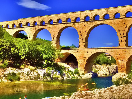Pont du Gard (neboli most přes řeku Gard) je mistrovské dílo římského stavitelství. Postaven byl patrně roku 19 př. n. l. za dob císaře Augusta. Ve století devátém přestal být používán. V 18. století byla vybudována cesta vedoucí po nejnižší řadě oblouků. V 19. století byl výrazně rekonstruován. Mnoho podobných památek nepřežilo dlouhou dobu středověku, ale akvadukt měl štěstí. Přestože Římská říše padla po nájezdech barbarů, akvadukt sloužil dál až do devátého století, ale přibližně od čtvrtého století začal být zanedbáván a kvalita vody i rychlost průtoku se postupně zhoršovala. Od desátého století přestal akvadukt sloužit svému účelu a jeho značná část byla v průběhu dalších století rozebrána na stavební materiál, i když většina akvaduktu, tedy celých 35 kilometrů, vedla pod zemí. Samotný Pont du Gard ovšem zůstal stát, sloužil totiž novým pánům jako důležitý most přes řeku Gard a díky tomu se dochoval v téměř dokonalém stavu až do současnosti. Na kahánku měl ovšem mnohokrát, naposledy třeba při obrovské potopě v roce 1958, při níž se ocitla celá spodní řada pilířů pod vodou.